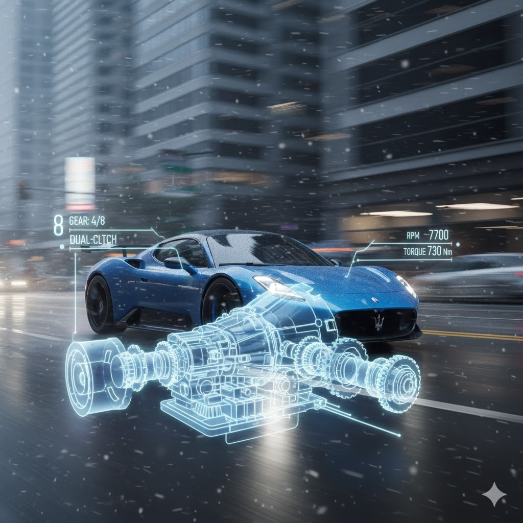 Maserati MC20 menggunakan transmisi dual-clutch 8-percepatan yang dirancang untuk perpindahan gigi cepat dan presisi. Transmisi ini bekerja harmonis dengan karakter mesin Nettuno.